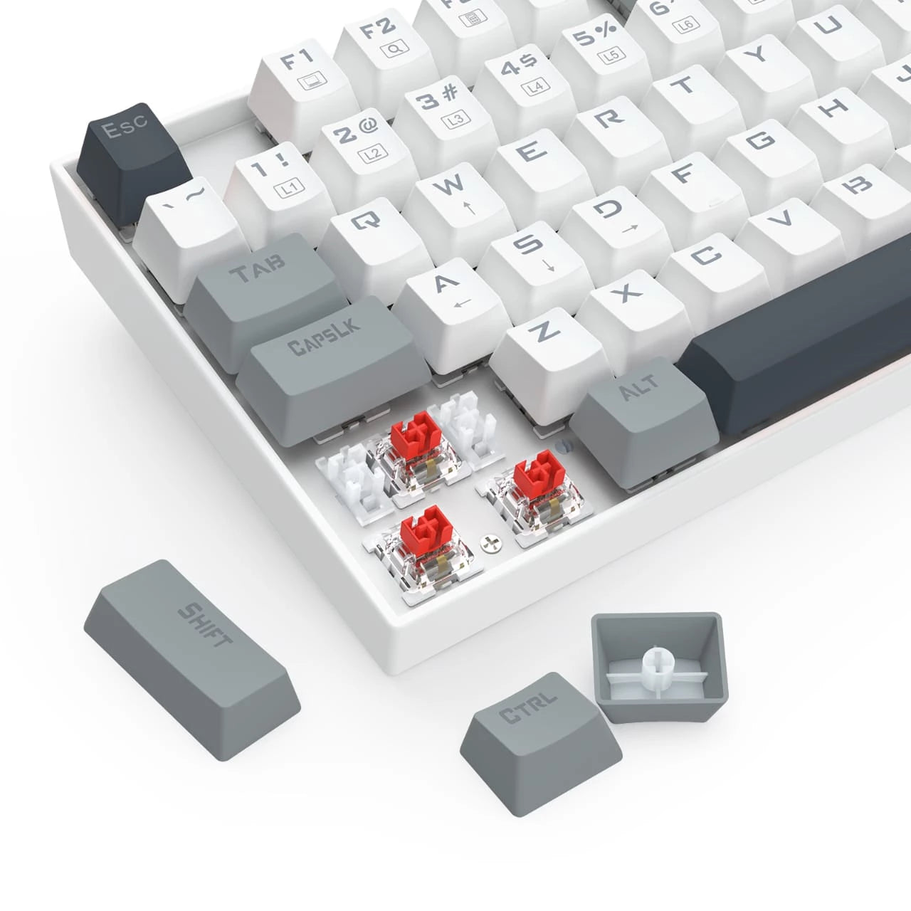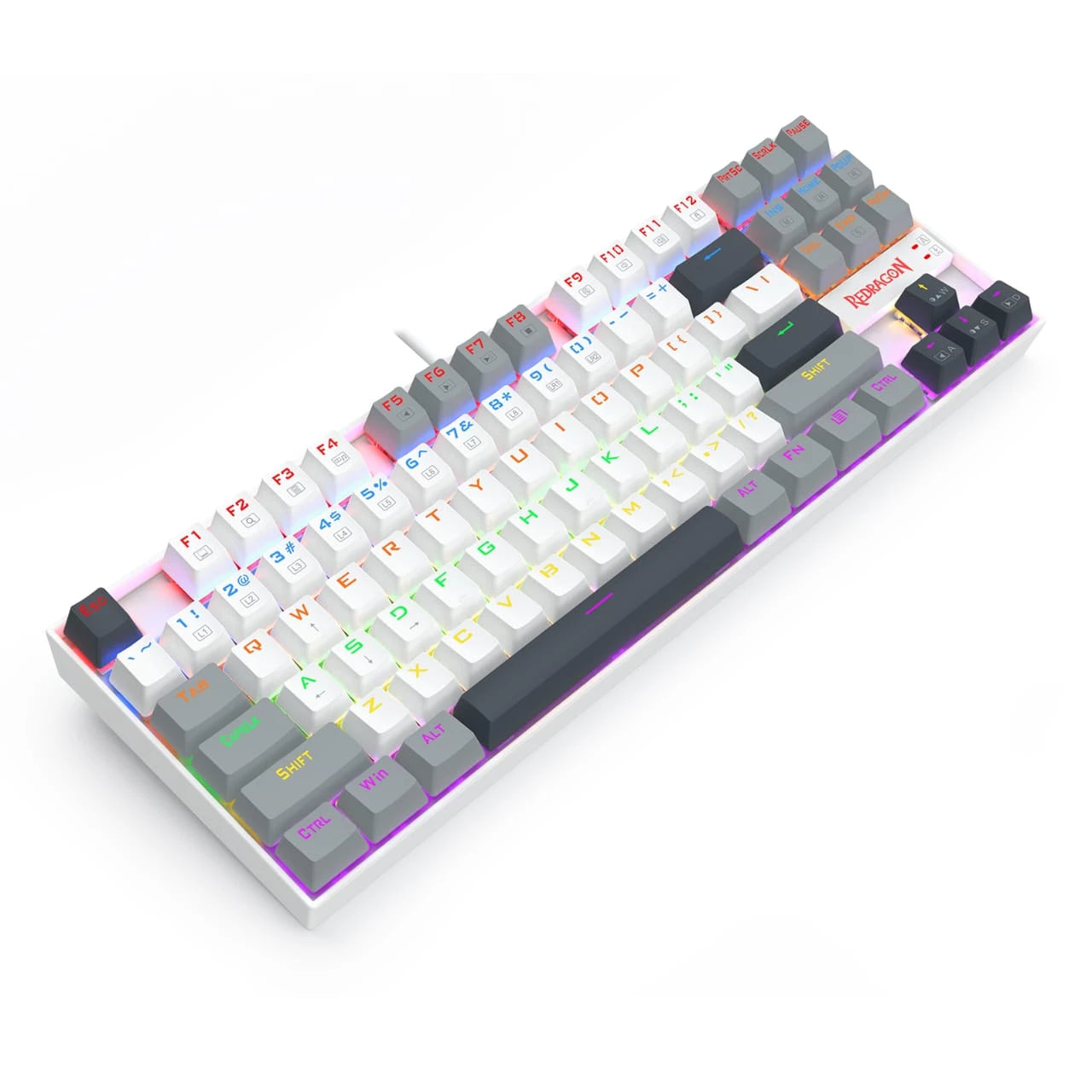 لوحة مفاتيح الألعاب الميكانيكية Redragon K552WGL-R Kumara اللاسلكية بدون مفاتيح رقمية تجمع بين التصميم الأنيق والأداء الموثوق. تتميز بمفاتيح حمراء ناعمة، وتصميم أبيض ورمادي أنيق، وإضاءة RGB نابضة بالحياة بألوان قوس قزح، مما يوفر حلاً متعدد الاستخدامات وصغير الحجم للاعبين والمحترفين الذين يبحثون عن حرية لاسلكية دون أي تنازلات.